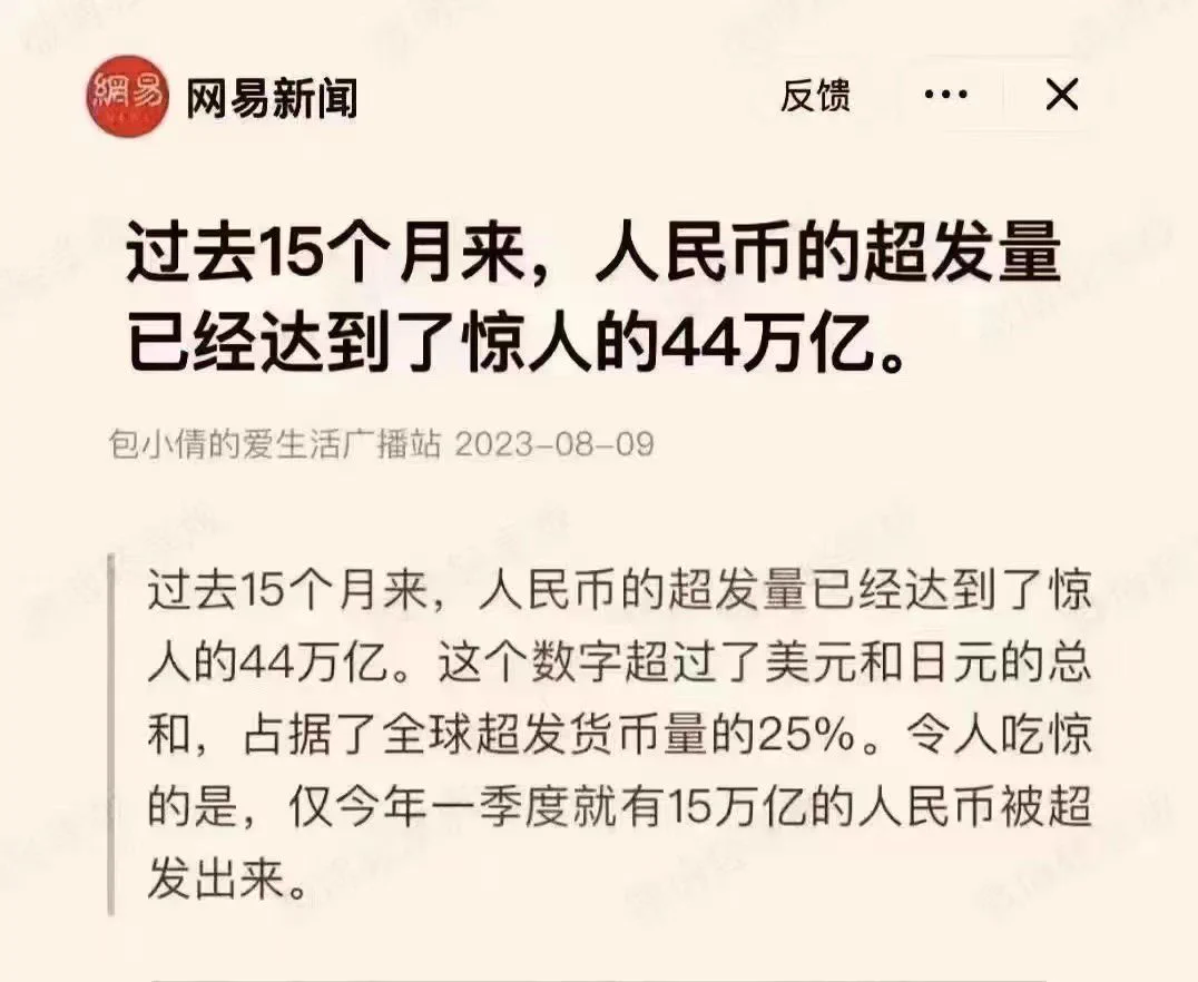 蔡慎坤 @cskun1989 9月8日,离岸在岸人民币兑美元继续下跌,创下16年以来的新低。为了保住人民币汇率,中国央行接连降息、国有银行不断抛售美元,又于9月1日宣布,向外汇市场注入约160亿美元流动性,推出防范人民币贬值的“防御性”政策工具,然而此举依然没有能够阻止人民币的跌势。 来自央行2023年8月11日发布的截至2023年7月末的金融统计数据报告,货币M2达到285.4万亿人民币!过去15个月以来,人民币的超发量已经达到了惊人的44万亿元。这个数字超过了美元和日元新增货币量的总和,占据了全球同期货币新增量的25%。 货币超发最大的受益者是政府,政府有天然的通货膨胀冲动,这不仅在金属货币时代表现为偷工减料,劣币取代良币,表现在纸币时代,就是非常轻易地启动印钞机,实行所谓量化宽松向市场放水的政策。 Translate post 12:29 PM · Sep 9, 2023 · 81.4K Views